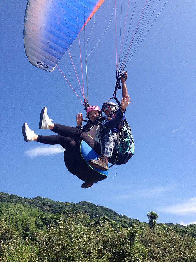 タンデムパイロットが操縦する二人乗りパラグライダーで